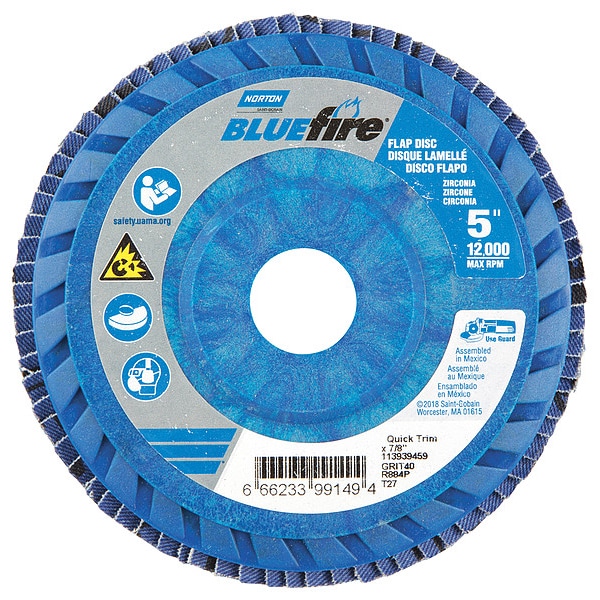 Flap Disc, Abrasive Type Coated, Abrasive Material Zirconia Alumina, Grade Extra Coarse, Backing Plate Material Plastic, Connector Size 7/8 in, Connector Type Unthreaded Hole, Density Rating Standard, Flap Disc Type Type 27, Overall Diameter 5 in, Series BlueFire R884P, Backing Material Cotton, Backing Weight Y, Coating Coverage Semi-Open, Grit P40, Maximum Operating Speed 12,000 RPM, Color Blue, Features Trimmable