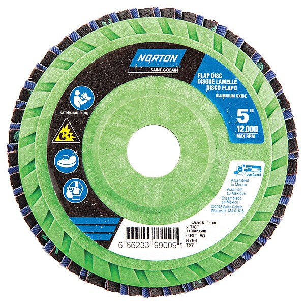 Flap Disc, Abrasive Type Coated, Abrasive Material Aluminum Oxide, Grade Medium, Connector Size 7/8 in, Flap Disc Type Type 27, Overall Diameter 5 in, Series Neon, Backing Material Plastic, Backing Weight Y, Grit 60, Maximum Operating Speed 12,000 RPM, Color Green
