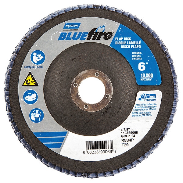 Flap Disc, Abrasive Type Coated, Abrasive Material Zirconia Alumina, Grade Extra Coarse, Backing Plate Material Fiberglass, Connector Size 7/8 in, Connector Type Unthreaded Hole, Density Rating Standard, Flap Disc Type Type 29, Overall Diameter 6 in, Series BlueFire R884P, Backing Material Cotton, Backing Weight X, Coating Coverage Semi-Open, Grit P24, Maximum Operating Speed 10,200 RPM, Color Blue
