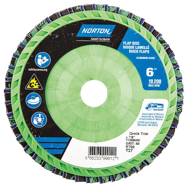 Flap Disc, Abrasive Type Coated, Abrasive Material Zirconia Alumina, Grade Extra Coarse, Backing Plate Material Plastic, Connector Size 7/8 in, Connector Type Unthreaded Hole, Density Rating Standard, Flap Disc Type Type 27, Overall Diameter 6 in, Series Gemini R766, Backing Material Cotton, Backing Weight X, Grit P40, Maximum Operating Speed 10,200 RPM, Color Blue, Features Trimmable
