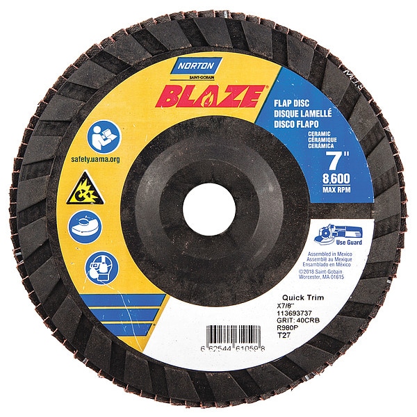 Flap Disc, Abrasive Type Coated, Abrasive Material Ceramic, Grade Extra Coarse, Backing Plate Material Plastic, Connector Size 7/8 in, Connector Type Unthreaded Hole, Density Rating Standard, Flap Disc Type Type 27, Overall Diameter 7 in, Series Blaze R980P, Backing Material Polyester, Backing Weight Y, Grit 40, Maximum Operating Speed 8,600 RPM, Color Orange, Features Performance Coated, Trimmable, Resistance Properties Fray