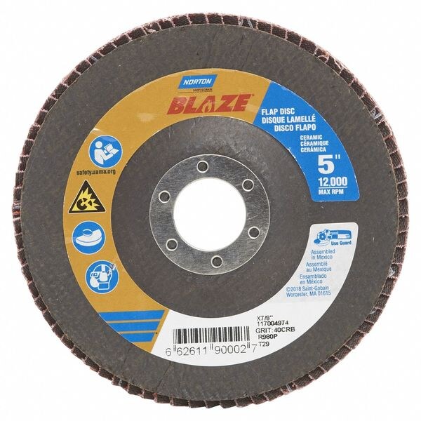 Flap Disc, Abrasive Type Coated, Abrasive Material Ceramic, Backing Plate Material Fiberglass, Connector Size 7/8 in, Connector Type Unthreaded Hole, Density Rating Standard, Flap Disc Type Type 29, Overall Diameter 5 in, Series Blaze R980P, Coating Coverage Closed, Grit 40, Maximum Operating Speed 12,000 RPM, Color Blaze