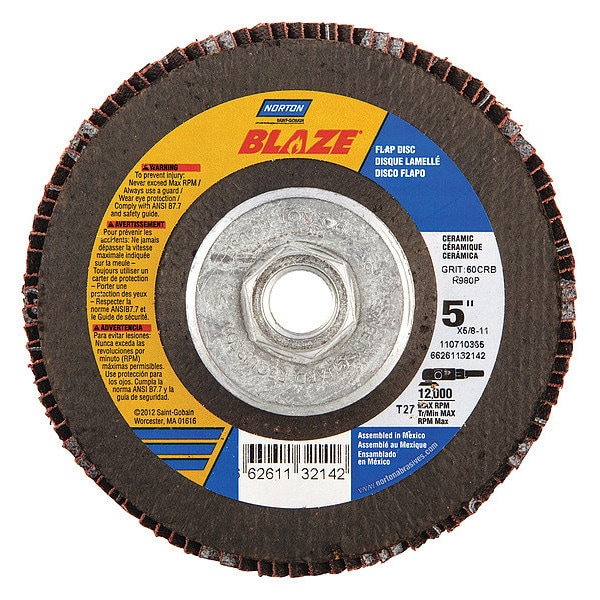 Flap Disc, Abrasive Type Coated, Abrasive Material Ceramic, Grade Coarse, Backing Plate Material Fiberglass, Connector Size 5/8 In.-11, Connector Type Threaded Hole, Density Rating High, Flap Disc Type Type 27, Overall Diameter 5 in, Series Blaze R980P, Backing Material Polyester, Backing Weight Y, Grit 60, Maximum Operating Speed 12,000 RPM, Color Orange, Features Performance Coated, Resistance Properties Fray