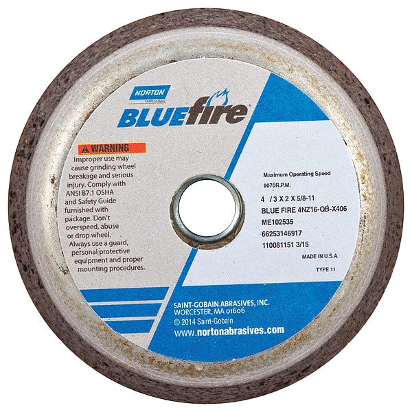 Flaring Cup Grinding Wheel, Abrasive Material Zirconia Alumina, Back Thickness 3/4 in, Connector Size 5/8 In.-11, Connector Type Threaded Hole, Grit 16, Overall Diameter 4 in, Overall Thickness 2 in, Rim Thickness 3/4 in, Primary Material Application Nickel Alloy, Stainless Steel, Steel, Titanium, Tool Steel, Compatible Tool Type Cup Grinder, Specification 4NZ16-QB-X406, Wheel Hardness Q, Wheel Type Type 11, Maximum Operating Speed 9,070 RPM, Series Blue Fire 4NV ZA, Bond Type Resin