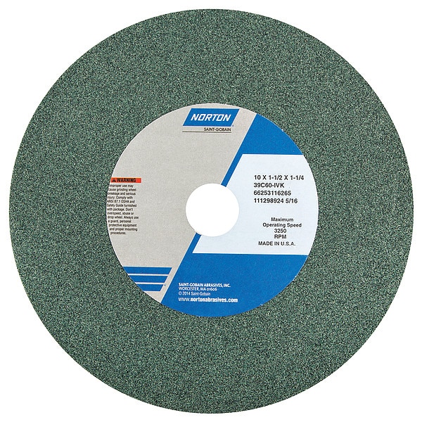 Silicon Carbide, Connector Size 1 1/4 in, Connector Type Unthreaded Hole, Grit 60, Overall Diameter 10 in, Overall Thickness 1 1/2 in, Compatible Tool Type Bench Grinder, Pedestal Grinder, Primary Material Application Aluminum, Brass, Bronze, Cast Iron, Copper, Masonry, Natural Stone, Stainless Steel, Titanium, Specification 39C60-IVMT, Wheel Hardness I, Wheel Type Type 1, Maximum Operating Speed 3,250 RPM, Series 39C, Grade Medium, Bond Type Vitrified, Color Green, Item Straight Grinding Wheel