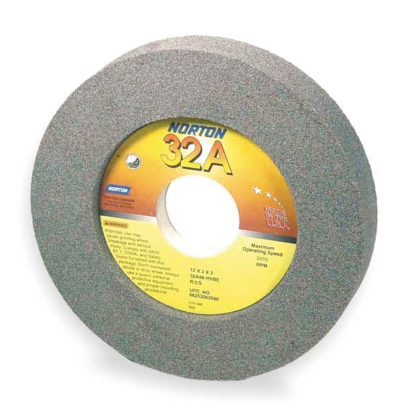 Recessed Grinding Wheel, Abrasive Material Aluminum Oxide, Connector Size 5 in, Connector Type Unthreaded Hole, Grit 46, Overall Diameter 12 in, Overall Thickness 2 in, Wheel Hardness J, Specification 32A46-JVBE, Wheel Type Type 7, Compatible Tool Type Cylindrical Grinder, Surface Grinder, Primary Material Application Aluminum, Cast Iron, Stainless Steel, Steel, Tool Steel, Maximum Operating Speed 2,070 RPM, Recess Depth 1/2 in, Recess Diameter 7 1/2 in, Bond Type Vitrified, Color Purple