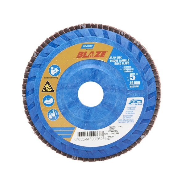 Flap Disc, Abrasive Type Coated, Abrasive Material Ceramic, Grade Extra Coarse, Backing Plate Material Plastic, Connector Size 7/8 in, Connector Type Unthreaded Hole, Density Rating Standard, Flap Disc Type Type 27, Overall Diameter 5 in, Series Blaze R980P, Backing Material Polyester, Backing Weight Y, Grit 40, Maximum Operating Speed 12,000 RPM, Features Performance Coated, Trimmable, Resistance Properties Fray