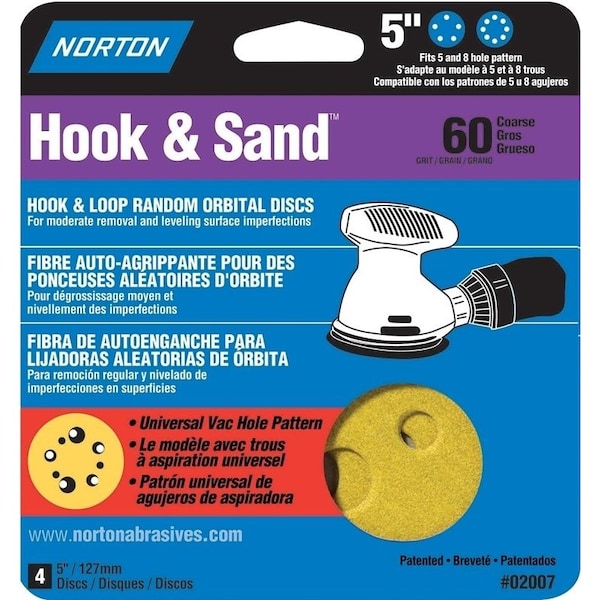 0 Sanding Disc, 5 in Dia, Coated, P60 Grit, Coarse, Aluminum Oxide Abrasive, Universal Vacuum