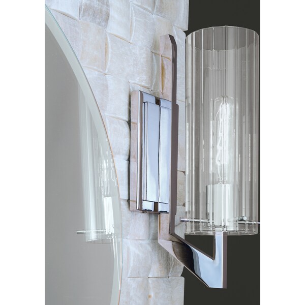 This Sconce Offers A Ribbed, Clear Glass. Cylinder. The Unique Glass Detail Is Complemented By A Sleek Angular Arm. The Ribbed Glass Is Supported By Clean, Ornamental Screws That Seamlessly Hold The Glass In Place. Accepts One 60-Watt Medium Base Incandescent Or Led Replacement Bulb.