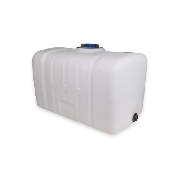 Utility Tank, Drain Connection Type Bulkhead Fitting, Drain Opening Diameter 1 in, Fill Opening Diameter 8 in, Liquid Storage Capacity 100 gal, Overall Depth 43 in, Overall Diameter Not Applicable, Overall Height 29 in, Overall Width 27 in, Tank Opening Type Closed Top, Color White, Fill Cap Diameter 8 in, Shape Rectangular