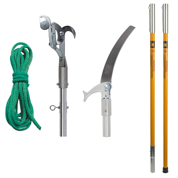 (2) 6 ft fiberglass poles & 15 inch heavy duty double thick blade, a Notch 1.25 in. pruner head & adapter and a 5/16 in. x 16 ft. pruner cord