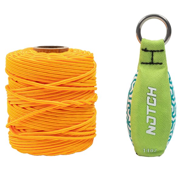 This Notch Throwline combo set gets you access high into the trees. This includes 200 ft. Neon 3mm polypropylene throw line and a 14 oz. Notch Throw weight. Makes access to high crotches a breeze. Carabiner loop on bottom of bag provides for easy line attachment.