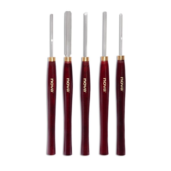 Nova 9034 Five Piece Standard Size Turning Chisel Set Contains A Popular Selection Of The Most Common Turning Chisels. Including A 3/8" Spindle Gouge, 3/4" Roughing Gouge, 3/8" Fingernail Bowl Gouge, 1/2" Round Nose Scraper, And A 1/2" Oval Skew Scraper All Packed In A Sturdy, Reusable Carton.