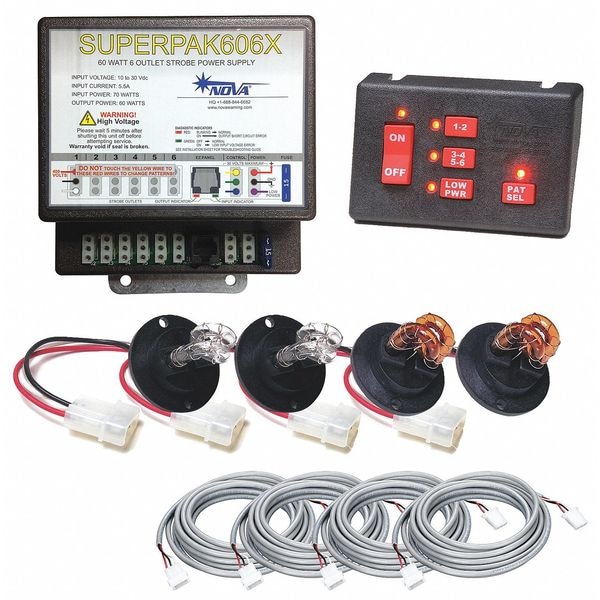 Strobe System, Number of Heads (4) Screw-In, Strobe Head Color (2) Clear, (2) Amber, Connection Type AMP, Number of Flash Patterns 15, Voltage 12 to 24V DC, Includes Strobe Heads, Power Supply, Power Cables, Momentary Switch, (2) 15 ft Cables, (2) 25 ft Cables