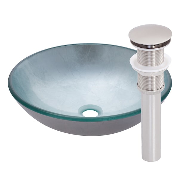 Combine quality and design with a unique glass vessel from Novatto. As an industry leader, Novatto uses advanced technology to produce beautiful glass vessel sinks with unmatched structural integrity and longevity. Constructed of thick 1/2-inch high tempered clear glass and finished with an exterior silver foil, this will enlighten any bath. Tempered glass cannot be compared to everyday synthetic porcelain and ceramics. Internal testing has found these vessels to be very durable and forgiving. Items such as toothbrushes or small jewelry should not scratch the surface. Made with the highest standards of quality and creative design, Novatto sinks add art and function to any decor at an affordable price. This sink has a standard 1.75-inch drain opening. The set includes a brushed nickel pop-up drain and matching mounting ring.
