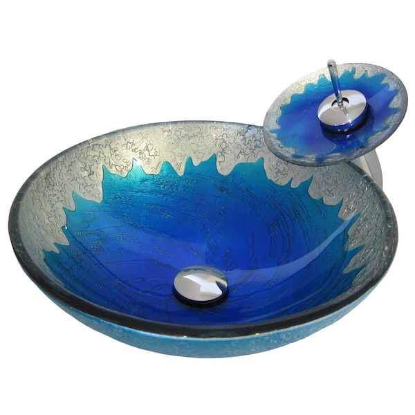 Enhance and harmonize your bath with Novatto's hand painted glass vessel and matching chrome waterfall faucet. The Diacco vessel features a bold hand-painted design of blue with silver trim. Novatto uses advanced technology, including computerized glass processing and Italian furnaces, to produce glass basins of unmatched structural integrity. This vessel sink and faucet combo is a great way to harmonize the decor by unifying the color and textural design of your bathroom. The matching faucet disc directs the water flow into a graceful waterfall. When a bath demands superior design and quality, Novatto's glass vessels add that touch. Each glass sink and faucet features its own beauty of color, structural character and texture, adding a sense of purity, elegance and distinctive look to any design.