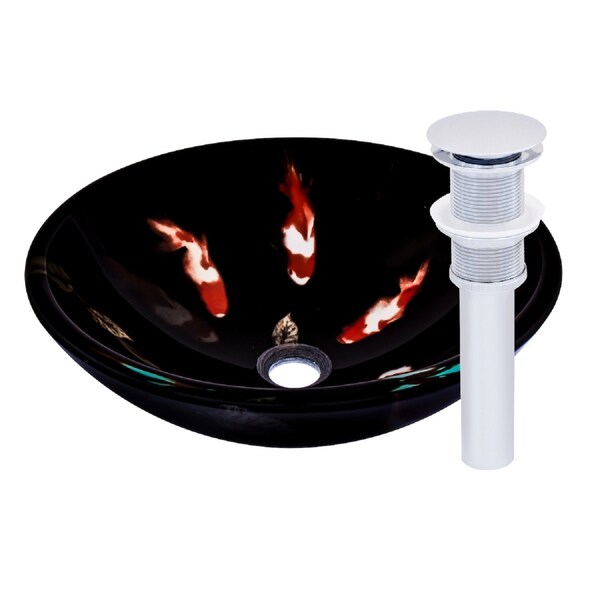 Combine quality and design with a unique glass vessel from Novatto. As an industry leader, Novatto uses advanced technology to produce beautiful glass vessel sinks with unmatched structural integrity and longevity. Constructed of thick 3/4-inch high tempered glass, Fiche is a double-layered round vessel sink with a design of koi fish on a dark background. The design pattern is locked between two layers of glass ensuring years of beauty. Internal testing has found these vessels to be very durable and forgiving. Made with the highest standards of quality and creative design, Novatto sinks add art and function to any bath or powder room at an affordable price. Fiche has a standard 1.75-inch drain opening. The set includes a chrome pop-up drain and matching mounting ring.