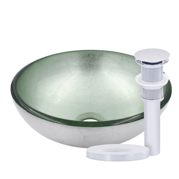 A perfect fit for small powder rooms or bathrooms. This 12-inch glass vessel sink works well where space is limited. Constructed of high tempered glass in a classic round shape, the Argento mini vessel has a fluorescent silver foil painted bottom. Novatto uses advanced technology to produce beautiful glass vessel sinks with unmatched structural integrity and longevity. Constructed of thick 1/2 inch clear high tempered glass, this silver vessel sink will add a punch of cool silver color to your decor. Internal testing has found these vessel sinks to be very durable and forgiving. Tempered glass cannot be compared to everyday synthetic porcelain and ceramics. Made with the highest standards of quality and creative design, Novatto sinks add art and function to any bath or powder room. The set includes a chrome pop-up drain and matching mounting ring.