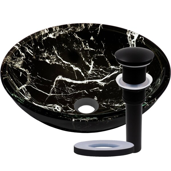 As an industry leader, Novatto uses advanced technology to produce unique glass vessel sinks with unmatched structural integrity and longevity. Constructed of thick 3/4" high tempered glass, the Pallina is a best-selling round glass vessel sink with a beautiful marbled black and white double-layer design. The design is layered between the glass to ensure beauty for years to come. Internal testing has found these vessels to be very durable and forgiving. Made with the highest standards of quality and creative design, Novatto sinks add art and function to any bath or powder room at an affordable price. Pallina has a standard 1.75-inch drain opening. The set includes a matte black pop-up drain and matching mounting ring.