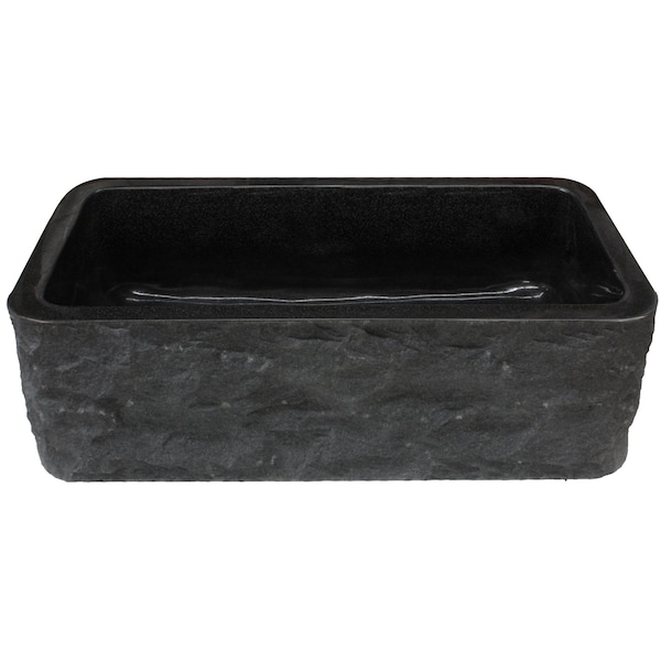 Simply stunning and built to last. This premier black granite kitchen sink handles any job in the kitchen all while being the center of attention. Three sides are polished while the front apron is chiseled to showcase raw granite texture and color. Outside dimensions measure 33-inches left to right by 18-inches front to back. The total height is 10-inches. The sidewalls are a solid 1.5-inches thick which gives an inside dimension of 30-inches by 15-inches and inside height of 8.5-inches. Keep in mind this sink is beautifully crafted by our master artisans so dimensions may vary up to a quarter inch. Colors and variations may also vary a little since it is natural stone, but this black granite is very consistent. This sink is made with a standard 3.5-inch drain opening and is compatible with disposals. Be sure to reinforce this sink when installing as it weighs 270 pounds!