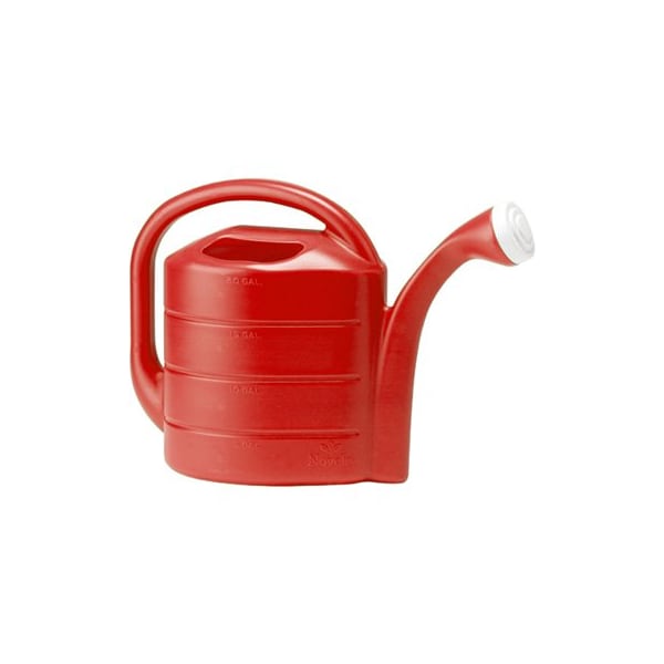 Novelty 2 gallon red deluxe watering can is a large capacity for outdoor use with 2 large fill holes The comfortable handle makes this can easy to use Moldedin imperial measurement markings are included Recyclable and includes 1 white nozzle