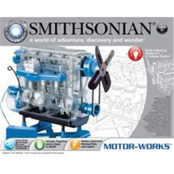 The Smithsonian Motor Works. Build a real working battery powered 4 Cylinder Model Engine with Real Lights and sounds. Watch the Spark Plugs Fire and the Valves Open and Close. See how the Pistons Fire with the Correct Timing and Watch the Belts and Fan turn. Includes, Over 100 parts that screw together easily, and detailed instructions. uses 2 AA Batteries, not included. Ages 8 and up. Includes 35"x23" Poster. Build a working model of a 4-Cylinder Engine. Valves Rock, Spark Plugs Fire and Pistons Drive Crankshaft! Battery Operated Moving Parts and Lights. Includes 2 Washers, 2 Shafts in various lengths, 4 Exhaust Valves, 4 Intake Valves, 8 Valve Stems, 4 Piston valves, 4 Connecting Rods, 8 Timing Cams, 8 Rocker Arms, 1 Crankshaft, 1 Crankshaft Pullery, 1 Fan Pullery, 1 Fan, 1 Engine Mounting stand, 5 Bearings, 1 Clutch Housing, 1 Oil-Pan, 1 Lower Crankcase, 1 Rocker Arm Cover, 1 Upper Cylinder Head, 1 Timing Belt, 1 Timing Wheel, 1 Timing Gear, 1 Belt Tensioning Pullery, 1 Lower Cylinder Head, 1 Cylinder Block, 1 Dipstick, 1 Positioning Jig, 1 Timing Belt cover, 1 Intake Manifold, 1 Exhaust Manifold, 1 Carburetor Cover, 1 Carburetor Bowl, 1 Front Half of Water Pump, 1 Rear Half of Water Pump, 1 Flywheel clutch, 1 Fan Belt, 1 head Basket, 8 Valve Springs, 1 Distributor Assembly, 1 Drive Module, 1 Battery Pack, 67 Screws.