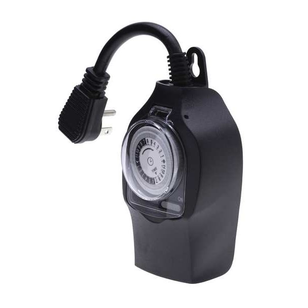 Plug-In Timer, Digital, Min. Time Setting 30 min, Max. Time Setting 24 hr, Max. On/Off Cycles Not Available, Voltage 125V AC, Watts 500 W, Amps 15 A, HP @ 120V 1/2 hp, HP @ 240V Not Available, Type of Switch Digital, Outdoor, Receptacles Not Available, Receptacle Type Not Available, Color Black, Length 8 7/20 in, Width 8 1/5 in, Depth 2 1/4, Style Plug In, Number of Gangs 2, Battery Type Not Available, Features Manual On Switch, Standards cUL, UL Listed