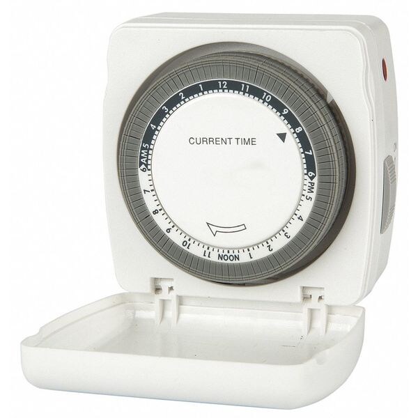 Plug-In Timer, Mechanical, Min. Time Setting 15 min, Max. Time Setting 24 hr, Max. On/Off Cycles 48, Voltage 120V AC, Watts 1,800 W, Amps 15 A, Type of Switch Mechanical, Indoor, Receptacles 1, Receptacle Type 1-15R, Color White, Length 3 in, Width 3 1/4 in, Depth 1 3/4 in, Style Plug In, Features Dial Cover, Manual Override, Standards CSA, UL Listed