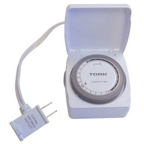 Plug-In Timer, Mechanical, Min. Time Setting 15 min, Max. Time Setting 24 hr, Max. On/Off Cycles 48, Voltage 120V AC, Watts 1800, Amps 15, Type of Switch Mechanical, Indoor, Receptacles 2, Receptacle Type (1) 5-15R Timed (1) 1-15R Untimed, Color White, Length 3 in, Width 3 1/4 in, Depth 1 3/4 in, Style Plug-In, Features Dial Cover, Manual On Switch, Table Top Remote, Standards CSA, UL Listed