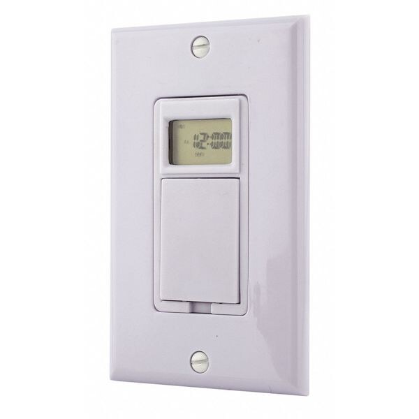 Wall Switch Timer, Min. Time Setting 1 min, Max. Time Setting 24 hr, Max. On/Off Cycles 10, Voltage 120V AC, Watts 1800, Amps 15, 1-Pole, HP @ 120V 1/2, HP @ 240V 1/2, Type of Switch Electronic, Receptacles 0, Color White, Length 1 3/4 in, Width 1 11/16 in, Style Wall Switch, Depth 2 in, Number of Gangs 1, Features Individual Programming for Each Day of the Week, Non-Replaceable Internal Rechargeable Battery, Standards cULus