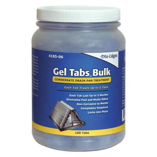 Condensate Pan Treatment, Gel Tablet, Size 4 lb, Color Blue, Application Prevents Slime Growth and Clogs In Drain Pans, Eliminates Foul and Musty Odors, Non-Corrosive Corrosive, Non-Toxic Toxic, For Use With System Size 5 t, Characteristics Includes 100 Tablets in Bulk, Up to 3 Months of Protection