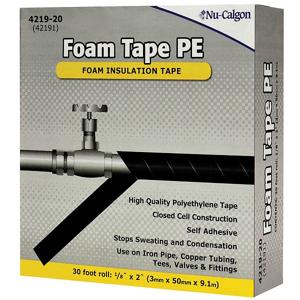 Tape Brand Nu-Calgon, Common Industry General Maintenance and Repair, Indoor/Outdoor, Imperial Tape Length 10 yd, Imperial Tape Width 2 in, Maximum Tape Performance Temperature 160 Degrees F, Minimum Tape Performance Temperature -20 Degrees F, Continuous Roll, Series Foam Tape PE, Surface Compatibility Metal, Tape Adhesive Material Acrylic, Tape Backing Material Polyethylene Foam, Insulation Tape, Metric Tape Length 9.1 m, Metric Tape Width 50 mm, Standards FMVSS 302, UL94