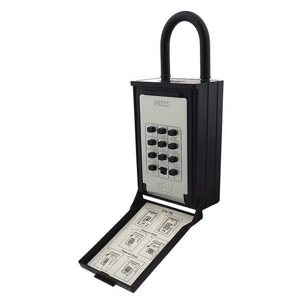 Lock Box, Padlock Mounting Type, Combination Locking Type, Key Capacity 5, Weather Resistant Yes, Height 7 3/4 in, Width 3 in, Depth 2 in, Zinc Alloy, Black/Gray, Includes Reset Tool