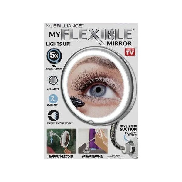 My Flexible Mirror by NuBrilliance lights up and has 10X magnification to make it easier than ever to see clearly. The strong suction cup base attaches easily to a mirror any smooth surface or can stand on a table. The LED light ring provides professional-quality natural light and the flexible arm can be positioned however you choose for makeup application and grooming. Makes applying makeup a breeze.