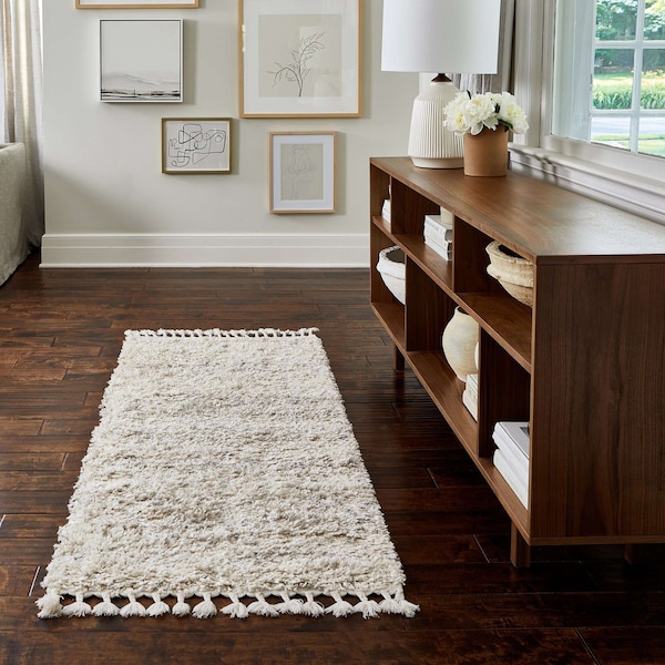 Indulge in the soft, plush feel of this cozy shag area rug. The contemporary elements are designed to pull the various components of your room together effortlessly. Machine made in Turkey of polypropylene for added durability and a plush pile to feel luxurious soft underfoot. With neutral hues and braided tassels lining the ends, this rug will seamlessly blend with any style from modern to bohemian. Enjoy every space in your home with our easy to care for and pet friendly area rugs.
