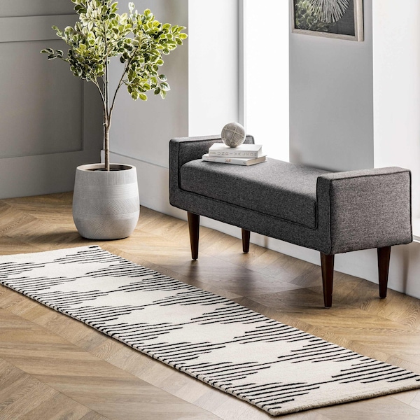 Elevate your living space with this pinstripe area rug. This piece exudes sophistication with its meticulously woven diamond pattern set against a tranquil ivory background. Made from high quality wool fibers, it not only offers a luxurious underfoot feel but also ensures durability and resilience. This wool rug provides an ideal balance of timeless design and comfort, adding a touch of elegance to any room. With various sizes available, it caters to diverse space and style needs, instantly enhancing your interior decor.