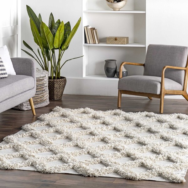 Add a little Moroccan flair to your home with this diamond trellis shag area rug. With a dynamically texture high/low pattern, this rug adds depth and dimension to your space will feeling incredibly soft underfoot. Machine made in Turkey of soft synthetic materials; this area rug is perfect for low traffic areas of your home that could use a cozy touch. Create the space youve always dreamed of our easy to care for and pet friendly area rugs.