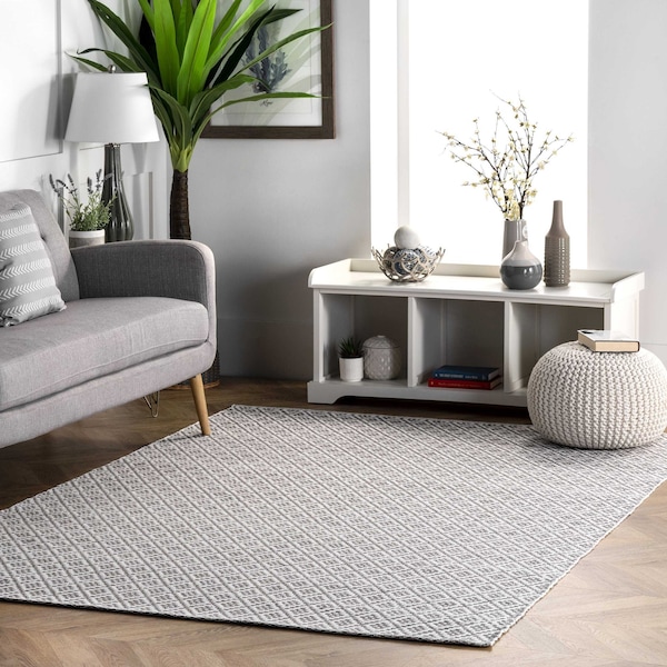 Enhance the modern flair of your family room with this rugfts intriguing geometric style motif. This hand tufted rug features a reversible design and presents a rich cotton texture underfoot, showcasing a soft and sturdy floor covering for busy areas. With its flatwoven construction, this area rug channels a low maintenance appeal.
