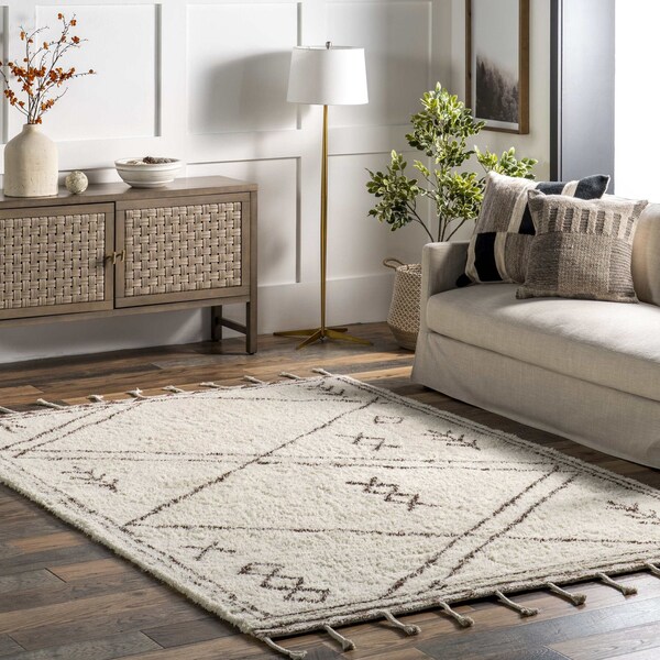 Elevate your space with this Moroccan area rug. Hand tufted in India; each piece is marked by subtle but individual differences that make your rug unique to your home. With a unique trellis pattern, neutral hues, and braided tassels lining each end, this floor covering will pair with any of your existing style from modern to bohemian. Create the home youve always dreamed of with our easy to care for and pet friendly area rugs.