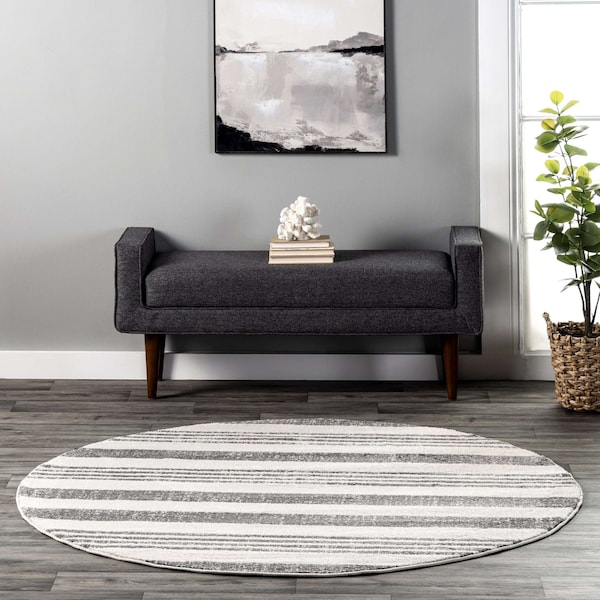 Bring lush, sophisticated style to your decor with this sumptuous rug, machine woven from durable and soft polypropylene yarns, the beautiful rug features an intriguing stripe pattern that alternates between large stripes and thinner triple stripes. Cool grey and ivory colors and a shed resistant construction enhance the minimalist appeal of this soft and long lasting rug.