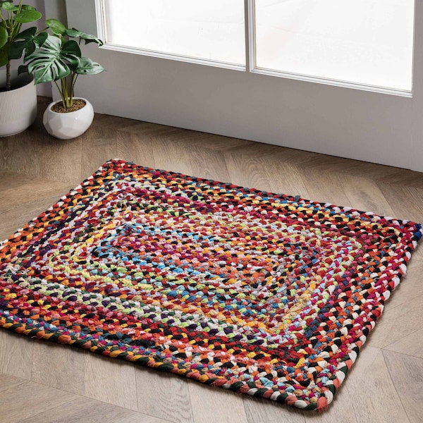 Brighten your room with this distinctively vivid bohemian area rug. Hand braided in India of recycled cotton, each piece carries with it a variation in color and pattern unique to the artisan who made it. This floor covering is the perfect addition to any space in your home that needs a pop of color. Create the home you have always dreamed of with our pet friendly and easy to care for area rugs.
