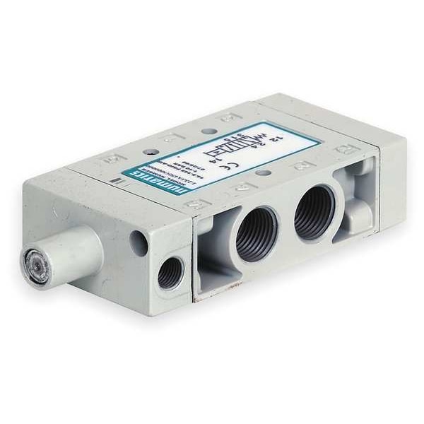 Pilot Air Control Valve, Valve Ways and Positions 4-Way/2-Position, Valve Actuator / Return Pilot / Spring, Valve Port Size 3/8 in, Max. CFM - Valves 78 cfm, Center Position Not Applicable, Max. Operating PSI 150 psi, Pilot Pressure 14.5 psi, Pilot Port Size NPT (In.) 1/8, Max. Temp. Range (F) 150, Vacuum Yes, Coefficient of Volume 1.7, Cycles per Minute -, Length (In.) 4 9/16 in, Width (In.) 1 in, Height (In.) 2 in, Uses For Air or Inert Gas, Pilot Air Control Valve