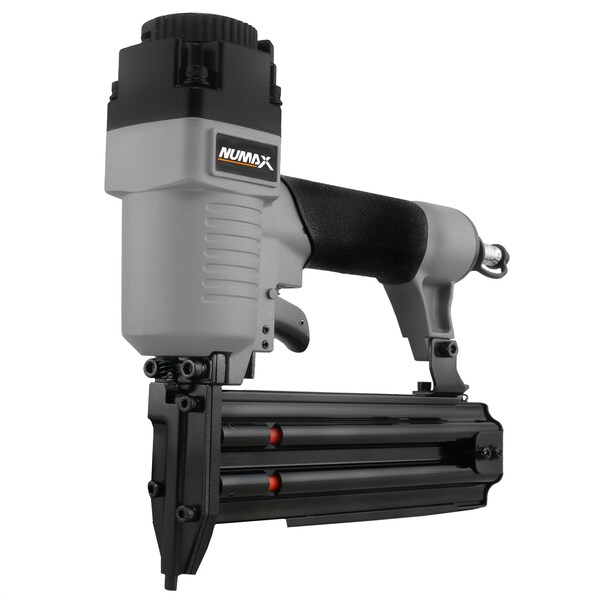 The NuMax SBR50 Pneumatic 18-Gauge 2" Brad Nailer is a great addition to your workshop or craft room, and is designed for applications such as decorative and furniture trim, base boards, crown moulding, window casing, chair rails, and picture frame assembly. Compatible with 18 gauge brad nails from 5/8" to 2", this air powered nail gun has an aluminum side loading magazine with a reload indicator to let you know when fasteners are running low. The ergonomic design of this durable die cast aluminum brad nailer provides great balance during use, and the comfort grip handle reduces fatigue and delivers precise control. A 360 degree adjustable exhaust allows you to direct air away from your face and work surface. The Pneumatic 18-Gauge 2" Brad Nailer will increase your productivity by allowing you to complete your DIY projects and professional contracts fast and easy