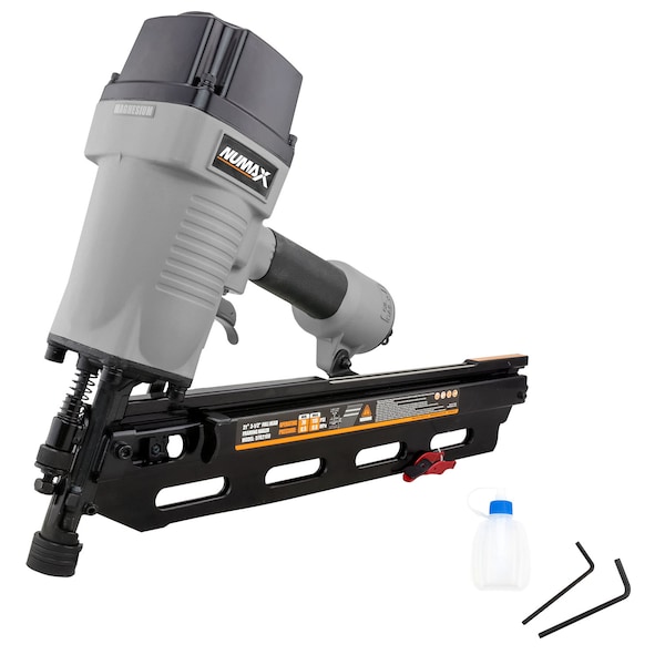The NuMax SFR2190 Pneumatic 21 Degree 3-1/2" Full Round Head Framing Nailer provides cost effective speed and power for projects such as framing, truss assembly, sheathing, subfloors, deck work, fencing, pallets, crates, and assembling furniture. This air powered nail gun is compatible with 21 degree 10-12 gauge plastic collated full round head framing nails from 2" to 3-1/2". The rugged framing nailer features a one piece drive blade for increased durability and a lightweight magnesium body perfect for extended use. A simple pull-back pusher makes the magazine easy to reload when the anti-dry-firing threshold is met, designed to reduce damage on internal components and extend the life of the tool. The dual mode trigger allows for bump or sequential firing, and the no mar safety contact tip eliminates damage to working surfaces. The framing nail gun also features a comfort grip handle for increased control during longer jobs, and a 360 degree adjustable exhaust to direct air away from your face. An air connector, air tool oil and adjustment tools are included. The Pneumatic 21 Degree 3-1/2" Full Round Head Framing Nailer is essential for DIY home improvement projects and professional contracts