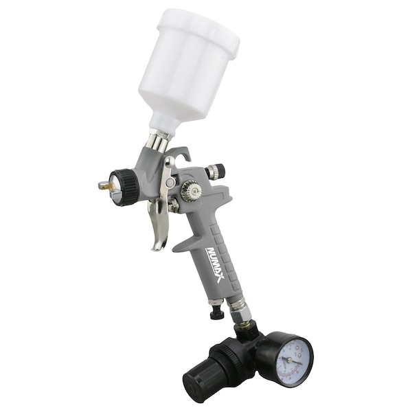 The NuMax SPS08 Pneumatic 0.8mm Tip Mini HVLP Gravity Feed Spray Gun with 125cc Plastic Cup is perfect for the atomization of paint. Use this air powered paint sprayer for projects around the home such as painting furniture and woodworking, along with automotive and industrial applications. This High Volume Low Pressure pneumatic spray gun generates high output with improved paint transfer, and has less overspray. Three adjustable control knobs (pattern, fluid, and air control) provide tremendous versatility with precision. The pattern control knob allows you to switch between a full or round spray, and the fluid control regulates the amount of paint mixed with air from the compressor. The air control knob is used to increase or decrease the overall air flow. Additionally, turning the air cap ring at the end of the nozzle adjusts the direction of the spray fan to either vertical or horizontal, useful when spraying either side to side or top to bottom. The trigger of this spray gun has a two-step design. Press the trigger to the first step and connect to the air source, ensuring the flow of air. Pressing further allows the spray gun to engage the paint in the 125cc (4 oz.) gravity fed cup. The one piece ergonomically designed body of this miniature paint sprayer is constructed of aluminum, while the needle and nozzle are made of stainless steel. This results in a balanced, light weight, and durable tool great for use over extended periods of time. A regulator and two different types of 1/4" NPT air connector fittings are included (standard and automotive), along with a cleaning kit and adjustment tool. The Pneumatic 0.8mm Tip Mini HVLP Gravity Feed Spray Gun with 125cc Plastic Cup will reduce paint costs and increase productivity for DIYers and contractors