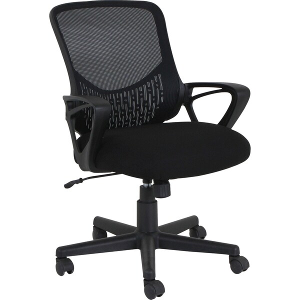 This mid-back mesh task chair offers customized positioning to maximize your comfort. Breathable mesh back conforms to your body. Padded seat with coil spring is upholstered in fabric and cushioned for a more relaxing day. Comfort functions include pneumatic seat-height adjustment, 360-degree swivel, adjustable tilt tension and tilt lock. Nylon base is equipped with dual-wheel casters for easy chair movement. Weight capacity is 250 lb.