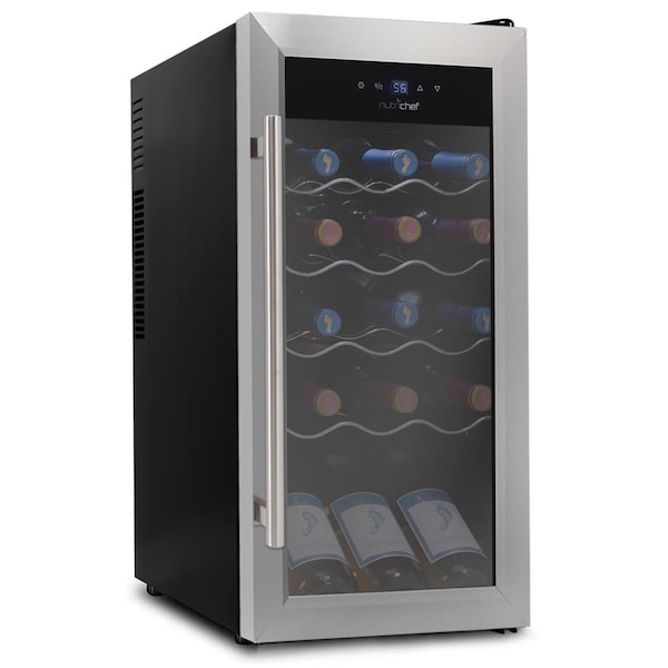 Features: - Stainless Steel Door and Handle - Contains Placement for Standing Bottles - Wine Chilling Refrigerator Cooler - (18) Wine Bottle Capacity - Compressor Fan Cooling Technology - Digital Touch Button Display Panel - Adjustable Temperature Control - Celsius and Fahrenheit Selectable (°C/°F) - Integrated LED Light with Power Control - Sensitive Touch Screen Control Button on Glass - Blue Temperature Display - Glass Door with Stainless Steel Door Frame - Built-in Circulation Fan & Ventilation Grill - Includes Contoured, Polished Chrome Wine Racks - Bottom Tall Shelf for Standing Wine Bottle Storage - Free-Standing Design for Floor, Table or Countertop Placement - Ultra-Quiet Operation What’s In The Box: - Compact Wine Fridge - (5) Chrome Wine Racks - (1) Bottom Standing Rack Technical Specs: - Wine Cooler Capacity: (18) Bottles - Internal Volume/Capacity: 50.5 Liters - Temperature Range: 41 - 64° Fahrenheit (5 - 18°C) - Standard Red Wine Bottle (DxH): 3.0’’ x 11.9’’ -inches - Housing Construction Material: Engineered ABS (Inner), Lacquered Iron (Shell) - Power Cable Length: 6.6 ft. - Power: 120V, 60 Hz - Unit Dimensions (W x D x H): 13.6’’ x 17.7’’ x 30.3’’ -inches