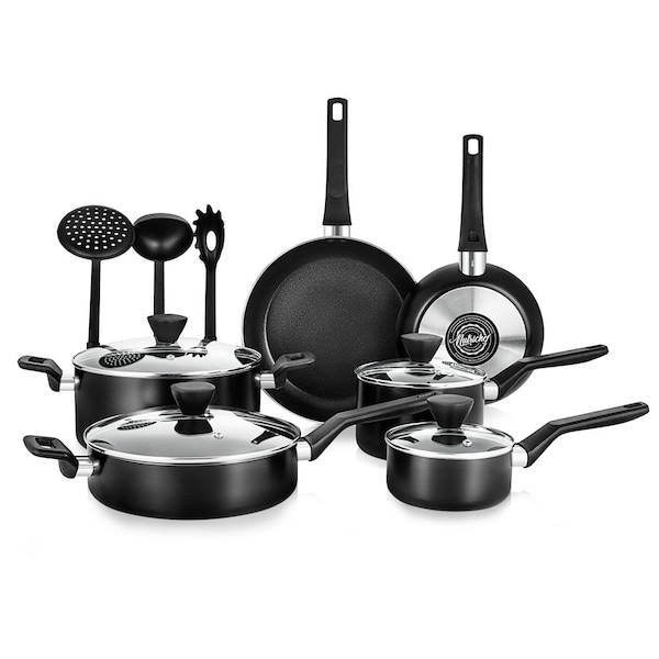 Features: - Professional Home Kitchenware - Stylish Modern Kitchen Cookware Design - Multi-Sized Cooking Pots with Lids - Small and Medium Skillet Fry Pans - Durable & Long Lasting Non-Stick Coating - Comfortable Cool-Touch Form-Fitting Handle Grips - Effectively Distributes & Retains Heat for Even Cooking All-Around - See-Through Tempered Glass Lids - Includes Heat-Resistant Kitchen Tool Utensils - Pots & Pans Safe for Gas, Electric, Ceramic & Counter Cooktops - PFOA Free What's In The Box: - Saucepan Pot with Lid, (1 qt) - Saucepan Pot with Lid, (2 qt) - Casserole with Lid (5 qt) - Sautepan Pot with Lid, (3 qt) - Open Fry Pan 8'' -inches - Open Fry Pan 10'' -inches - Soup Ladle - Pasta Fork - Strainer Technical Specs: - Max Temperature: 350° Fahrenheit (177° Celsius), Except Glass Lid - Construction Material: Aluminum Metal, Engineered Nylon, Tempered Glass - Interior Coating: Whitford Xylan Plus Non-Stick Coating - Coating Hardness: 1-2 Level HB - Saucepan Pot Size (L x W x H): 12.5'' x 5.7'' x 4.7'' -inches (with Lid) - Saucepan Pot Size (L x W x H): 13.3'' x 6.48'' x 6''' -inches (with Lid) - Saute Pan Pot Size (L x W x H): 20.1'' x 9.6'' x 5'' -inches (with Lid) - Casserole Size (L x W x H): 15.4'' x 9.6'' x 6.6'' -inches (with Lid) - Open Fry Pan Size (L x W x H): 114.8'' x 8'' x 3'' -inches - Open Fry Pan Size (L x W x H): 17.9'' x 10.4'' x 3.2'' -inches