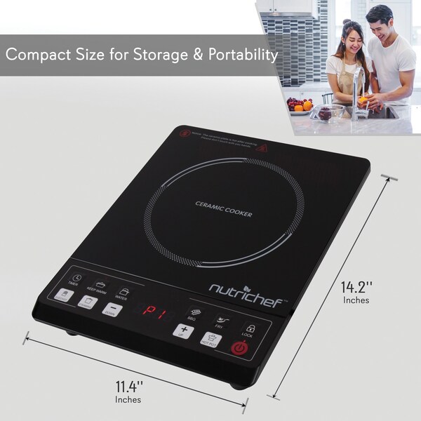 The NutriChef Electric Ceramic Cooktop provides convenient and hassle-free food prep. The tempered ceramic glass cooker features a simple plug-in design that is safe for table or countertop placement. The high-powered infrared heating element quickly heats and adjustable temperature controls will help you prepare all of your favorite foods. The ceramic glass burner cooker also features the unique keep warm function to plate warm food—ideal for any meal of the day. Additional system features include the front panel touch button controls, LCD digital display, non-stick and stain-resistant cooking surface, along with an energy efficient low power consuming design.