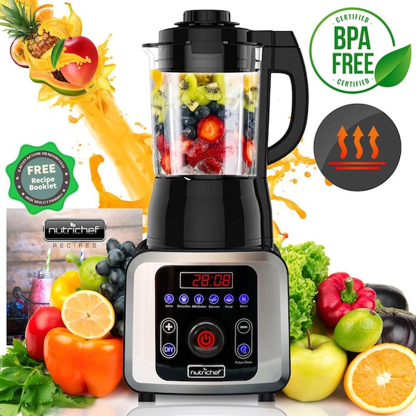 Features: - Professional Home Kitchen Blender System - Sleek, Modern Food Blender Style - Powerful High-Speed Blending Motor - Heating Function for Soup Maker Ability - Simple Electric Plug-in Design - Unique Button-Activated ‘Pulse’ Blend Ability - Warming ‘Keep Warm’ Mode - Adjustable Blending Time & Blend Speed Settings - LCD Display Screen with Digital Touch Button Controls - Multiple Preset Programmed Blend Modes - Stainless Steel Cutting Blade - Reinforced Serrated Blades Blend Ice Easily - Powerful 360° Cylindrical Impact for Instant Nutrition Extraction - Stain Resistant, Heat-Resistant & Easy-to-Clean - Large Capacity Easy-Pour Container - BPA Free, Food Grade Construction - Safe for Placement on Any Kitchen Table or Counter - Perfect for Mixed Drinks, Fresh Juice Smoothies, Soups & More What's in the Box: - Electric Blender Base - Blend Container with Blade - Container Cover - Removable Lid Cap - Food Recipe Book Technical Specs: - High-Powered Blender Motor: 1000 Watt - Blend Speed Settings: Up 26,000+ RPM - Adjustable Speed Control: (9) Speed Settings - Adjustable Blend Time Setting: Up to 99 Minutes - Adjustable Heat / Temperature Setting: 90 - 210° Fahrenheit (32 - 99° Celsius) - Blending Cup Capacity: 1400ml / 47 oz. (Hot Food) - Blending Cup Capacity: 1750ml / 59 oz. (Cold Food) - Noise Operating Level: <90dB - Construction Material: Clear Tritan Blend Container, Engineered ABS Housing - Power Cable Length: 3’ ft. - Power Supply: 120V - Total Blender Size (L x W x H): 9.3’’ x 8.0’’ x 19.0’’ -inches